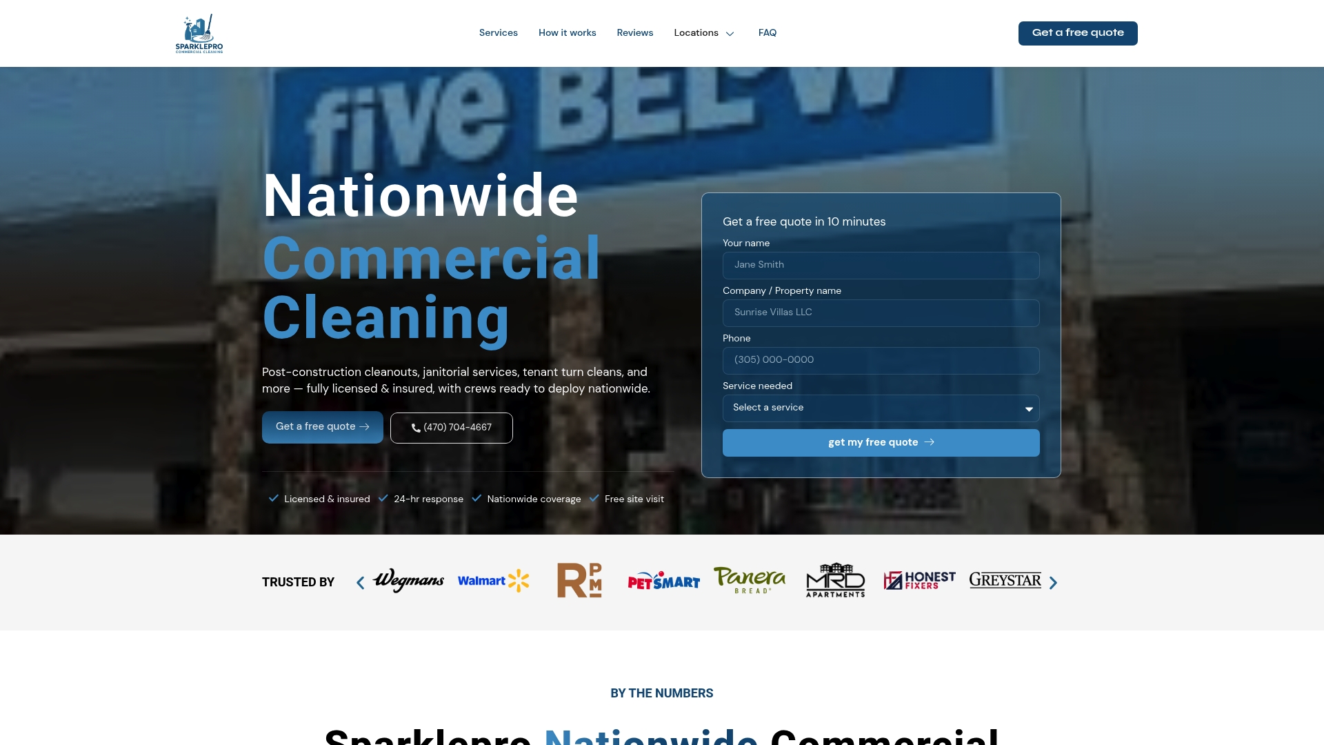 | Sparklepro Commercial Cleaning | Nationwide coverage, free site visits, customizable services | Licensed and insured crews, wide service range, consistent quality | Property managers, facility directors, multi-site portfolio managers | Pricing depends on square footage, property type, and frequency; free quotes provided |